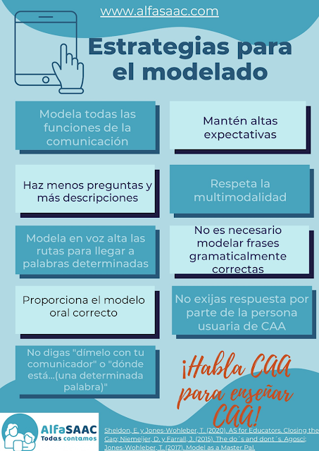 “Modelar forma parte del proceso de CAA de aprendizaje constante. El modelado siempre será una estrategia clave para ayudar a un usuario de CAA a aprender lenguaje y comunicación real” (Assistiveware, s.f.).